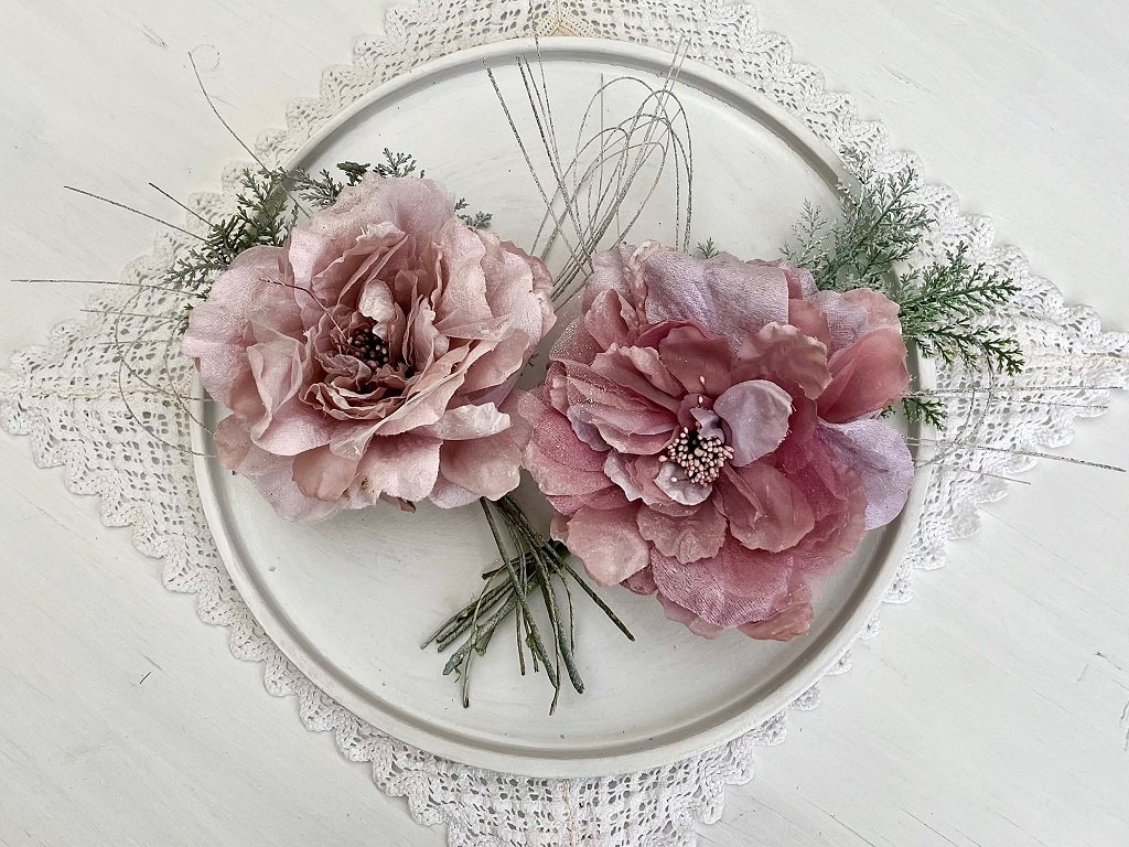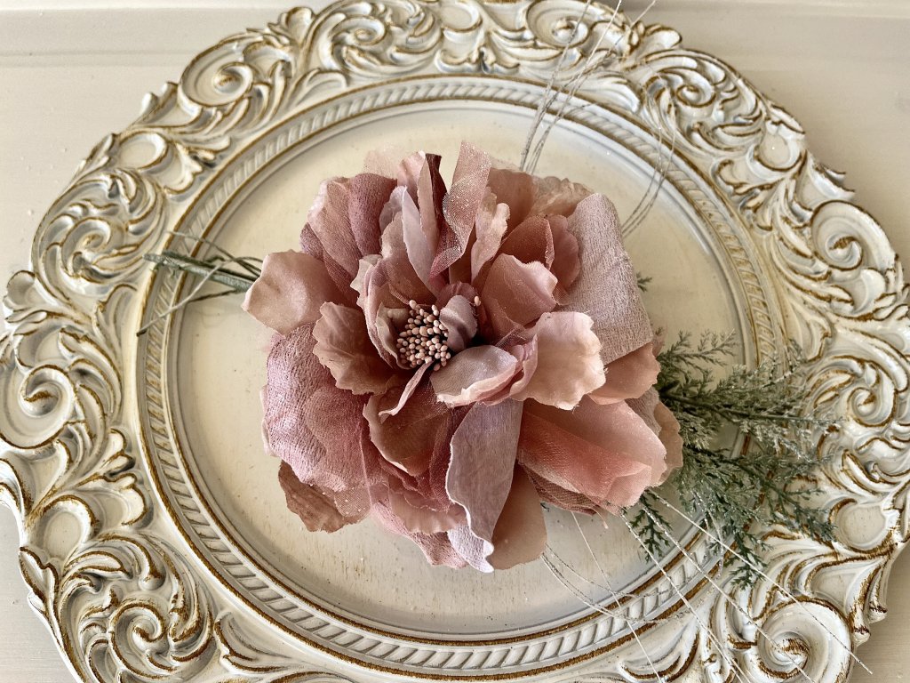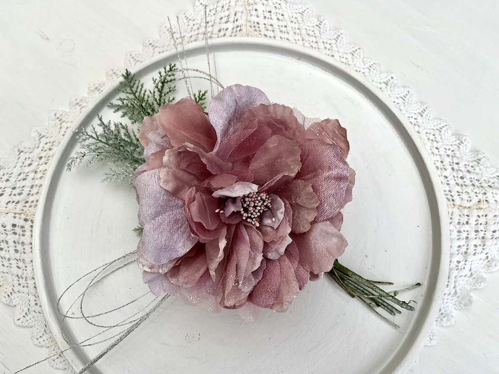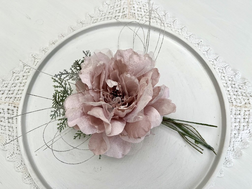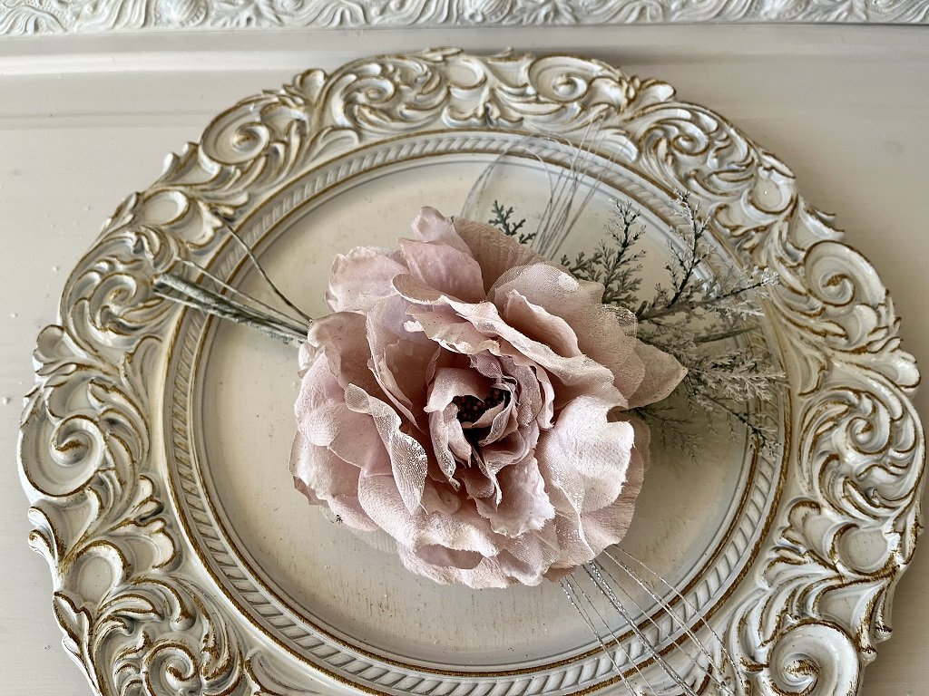 Ozdobte si Vánoce. Krásně propracovaný květ růže s ojíněnou větvičkou a stříbrnými pruty se bude hezky vyjímat ve slavnostních aranžmá, např. na věnci nebo ve váze.