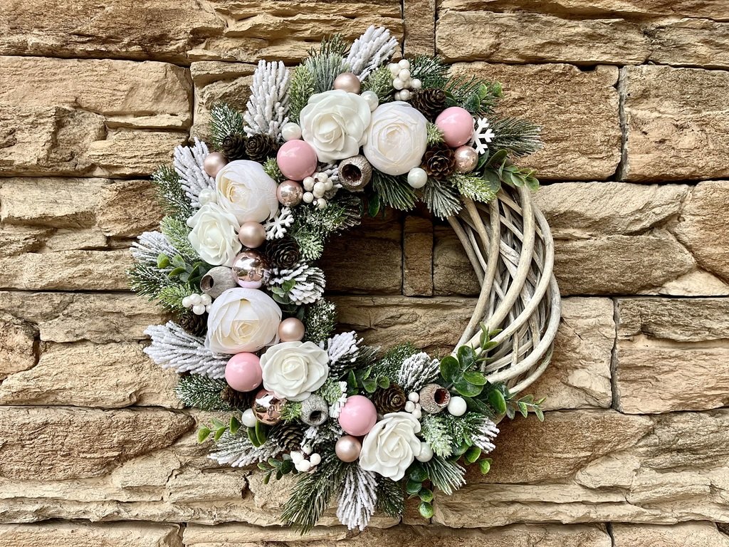 Zimní věnec na dveře s bílými růžemi, pryskyřníky a přízdobami v bílé a růžové barvě v kombinaci s přírodními materiály potěší všechny milovnice něžné krásy.