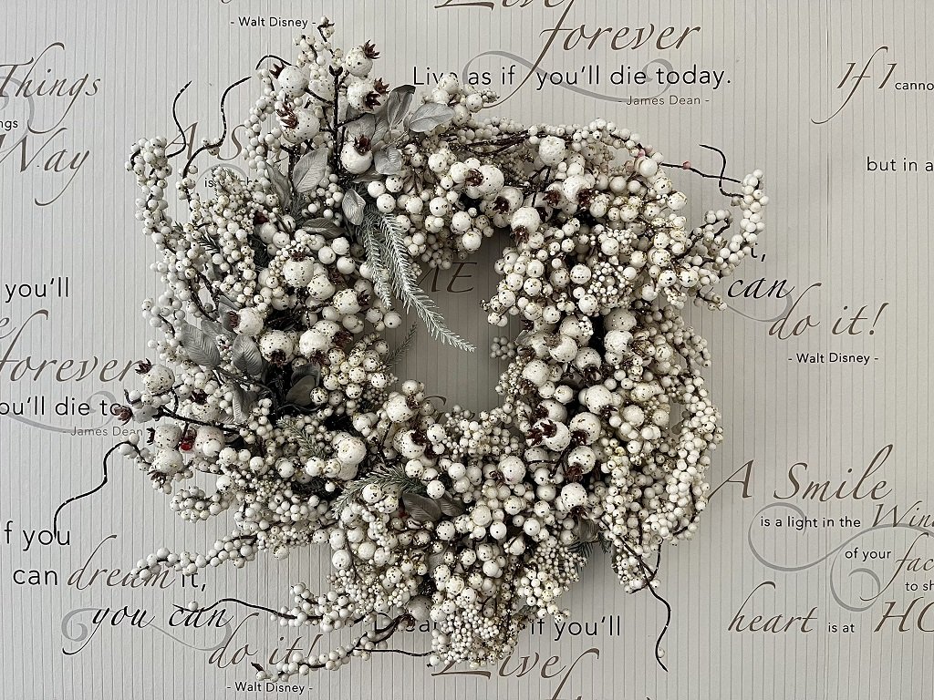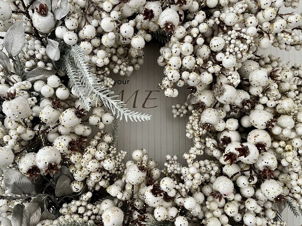 Ozdobte si Vánoce. Velký věnec s bílými bobulemi a zlatými třpytkami se bude krásně vyjímat na vchodových dveřích nebo okně.