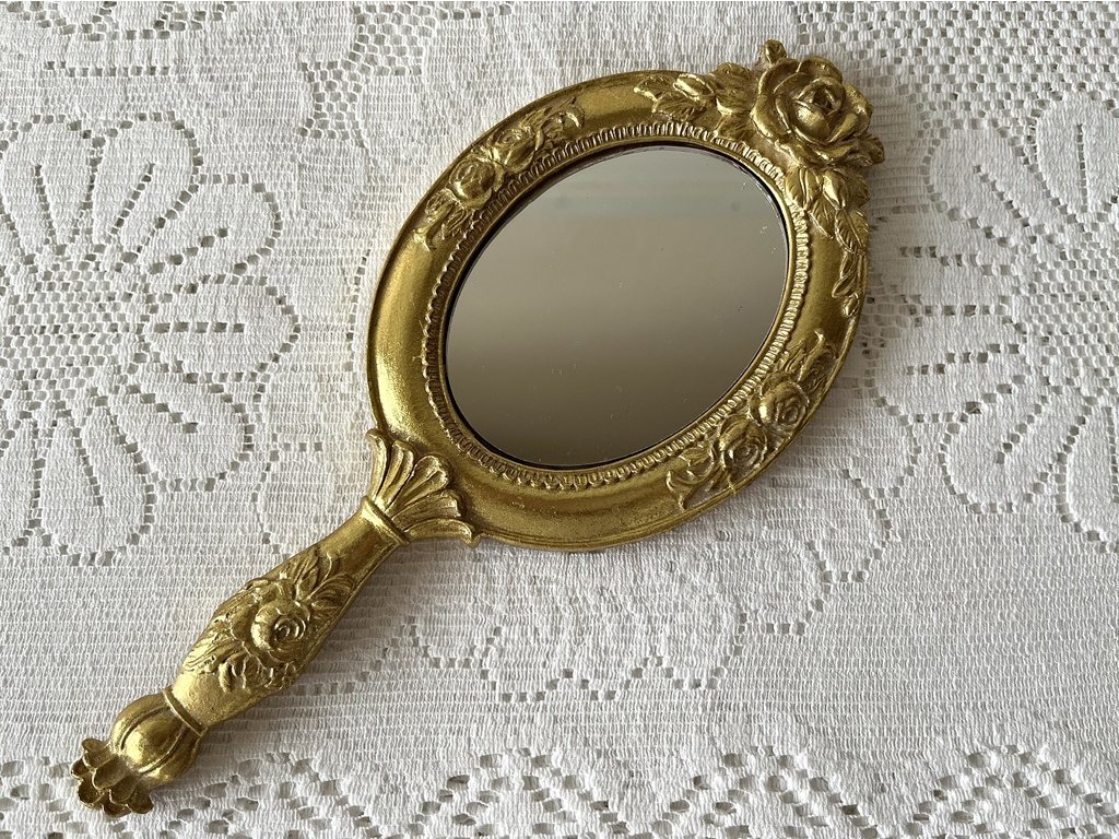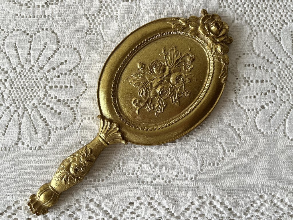Krásné romantické zlaté zrcátko s patinou a jemným dekorem růží potěší každou milovnici dávných časů...